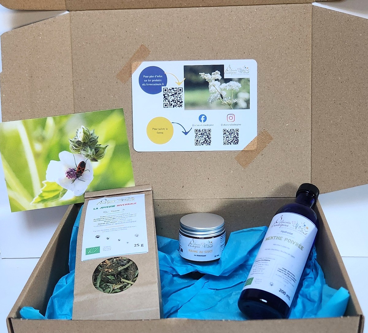 Un coffret cadeau comprenant, au choix parmi toutes les références du site: 1 tisane + 1 baume + 1 hydrolat 200 mL