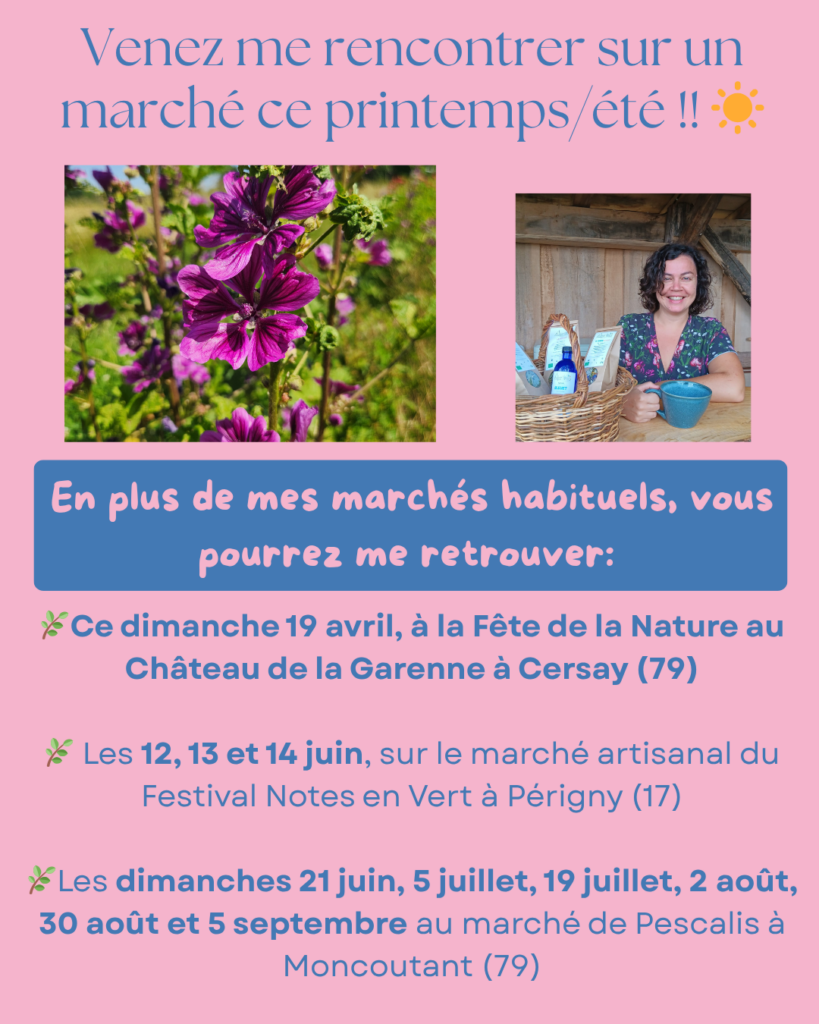 Quelques nouvelles des marchés ponctuels où vous pourrez venir me rencontrer et poser des questions sur mes produits ce printemps/été! 😊